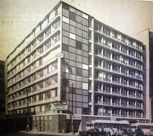 This is a view of buses in front of the Downtowner hotel after its opening in 1964 on the northeast corner of Tucker (then 12th St.) and Washington. The hotel currently stands, remodeled as an apartment building.