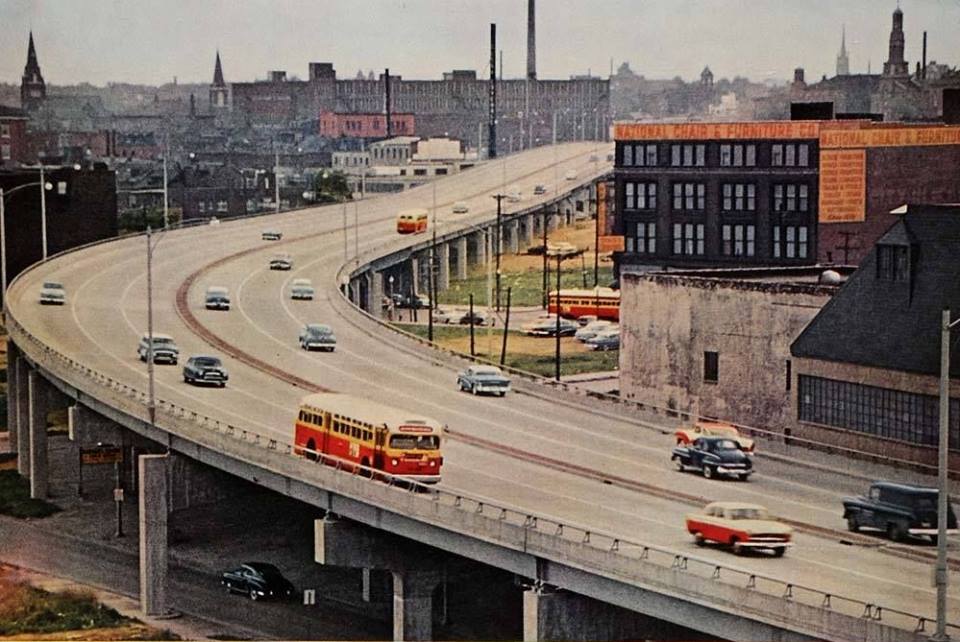 Today’s photo looks at the first 1.7 mile stretch of St. Louis’ new Third Street Highway in the mid-1950s. The sign on the bus reads, “Express South Grand.”