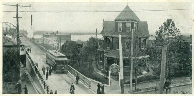 The terminus of the Old St. Charles Bridge was on the north end of the Old St. Charles Main Street business district at 2nd and Adams Streets. The combination highway and streetcar bridge opened in the spring of 1904 just in time for the world’s fair in St. Louis.