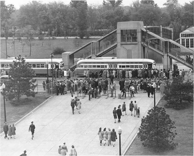 These are 51 FOREST PARK streetcars loading at the entrance to the Arena. The first one is a 1600 while the second is a 1500 series car (notice the different side windows). I would guess mid 1940s (the 1600s were delivered in 1941). The bridge is a pedestrian bridge over the Red Feather Expressway (US 40 at the time) into Forest Park. Road widening took the bridge away long ago.