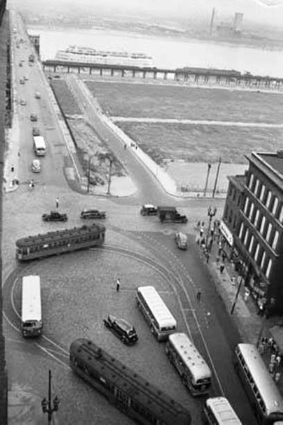 Today’s photo offers a unique perspective of Washington Avenue, approaching the Eads Bridge in 1942. The streetcars and buses look like toys – one might expect a kid’s hand to come down to maneuver them around the loop.
